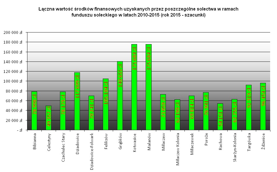 W Gminie Malanów fundusz sołecki funkcjonuje od samego początku, tzn. od 2010 roku. Dzięki niemu w ciągu minionych 4 lat mieszkańcy na swoje potrzeby wydatkowali już ponad 1 mln zł. Na co zostały przeznaczone te środki? Wystarczy rozejrzeć się w około: drogi, oświetlenie, remonty świetlic, obiekty sportowo-rekreacyjne, zakup wyposażenia świetlic, doposażenie straży, przystanki szkolne, tablice informacyjne, festyny… pomysłów jest wiele. Łącznie w latach 2010-2015 mieszkańcy wydadzą kwotę przekraczającą 1,5 mln zł!