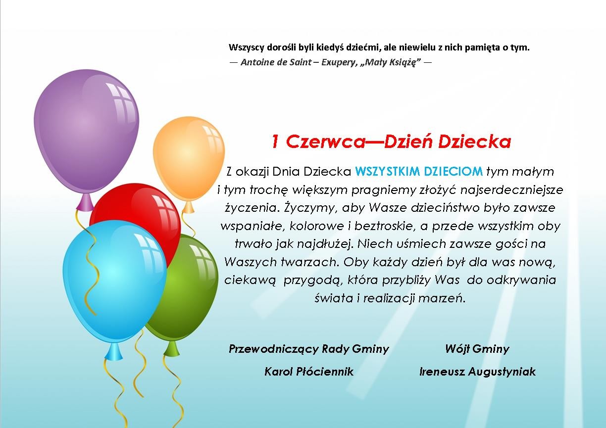 Z okazji Dnia Dziecka WSZYSTKIM DZIECIOM tym małym i tym trochę większym pragniemy złożyć najserdeczniejsze życzenia. Życzymy, aby Wasze dzieciństwo było zawsze wspaniałe, kolorowe i beztroskie, a przede wszystkim oby trwało jak najdłużej. Niech uśmiech zawsze gości na Waszych twarzach. Oby każdy dzień był dla was nową, ciekawą przygodą, która przybliży Was do odkrywania świata i realizacji marzeń.