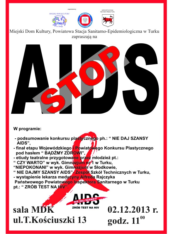 Ponadto Miejski Dom Kultury, Powiatowa Stacja Sanitarno-Epidemiologiczna w Turku zapraszają na spotkanie STOP AIDS, które odbędzie się dnia 02.12.2013 r. o godz. 11:00 w sali Miejskiego Domu Kultury w Turku, ul. Kościuszki 13. Więcej szczegółów na plakacie poniżej.