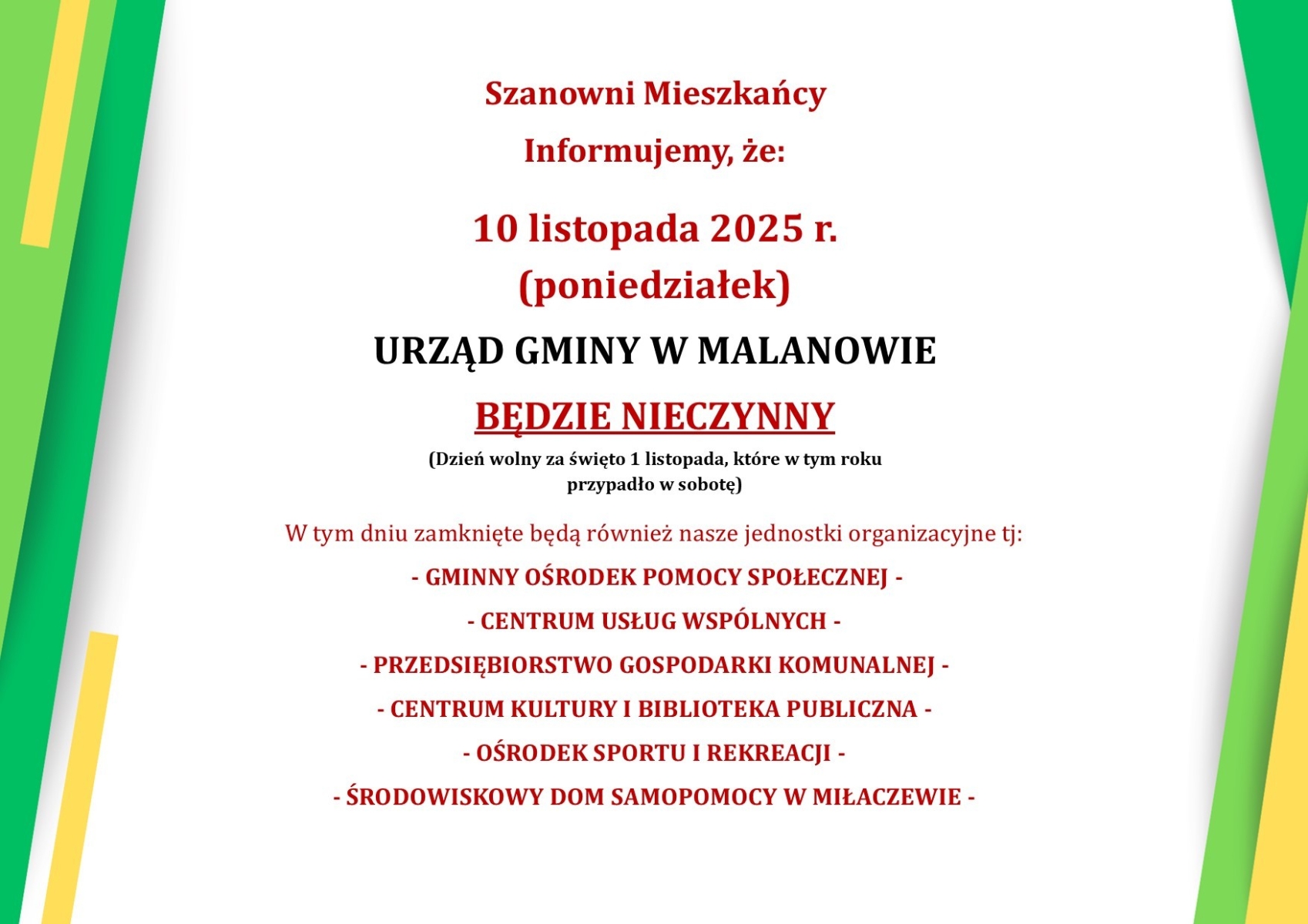 Informujemy, że 10 listopada 2025 r. (poniedziałek) Urząd Gminy w Malanowie będzie nieczynny