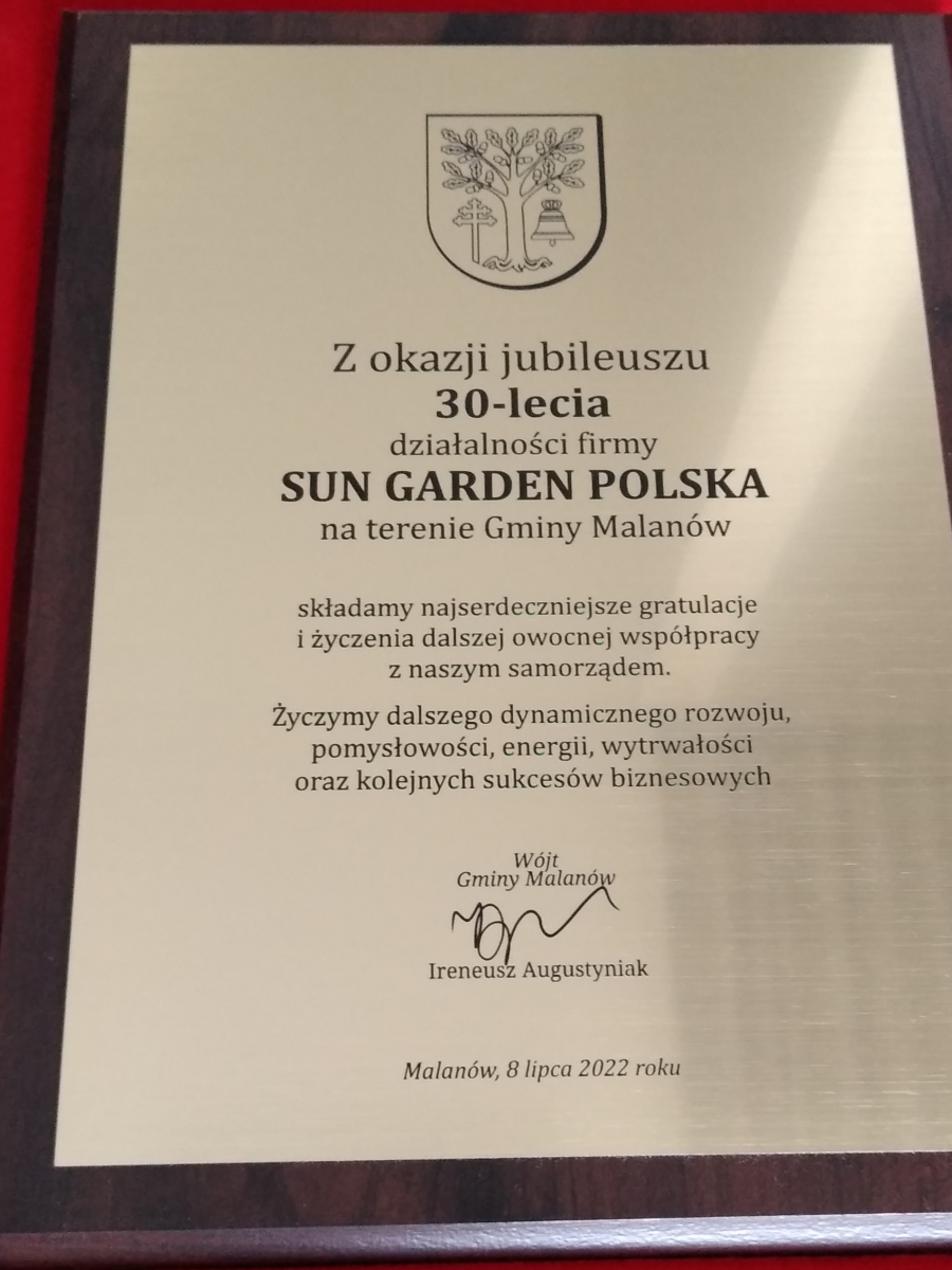 8 lipca 2022 r. na zaproszenie Ewalda Köstersa, Wójt Gminy Malanów – Ireneusz Augustyniak uczestniczył w jubileuszu 30 – lecia lokacji firmy Sun Garden w Malanowie.