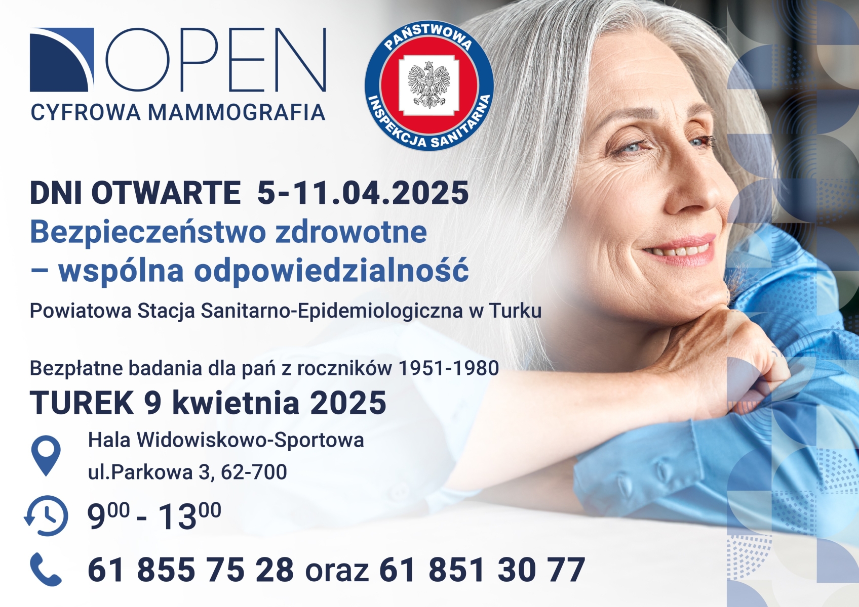 W trosce o zdrowie Pań naszego powiatu, Powiatowa Stacja Sanitarno-Epidemiologiczna w Turku zaprasza na bezpłatne badania mammograficzne i cytologiczne, organizowane z okazji Dni otwartych PIS pod hasłem „Bezpieczeństwo zdrowotne – wspólna odpowiedzialność”. Ich celem jest wczesne wykrywanie zmian nowotworowych, które mogą uratować życie. Badania te są kluczowym elementem profilaktyki nowotworów piersi i szyjki macicy, których wczesne wykrycie znacząco zwiększa szanse na skuteczne leczenie!