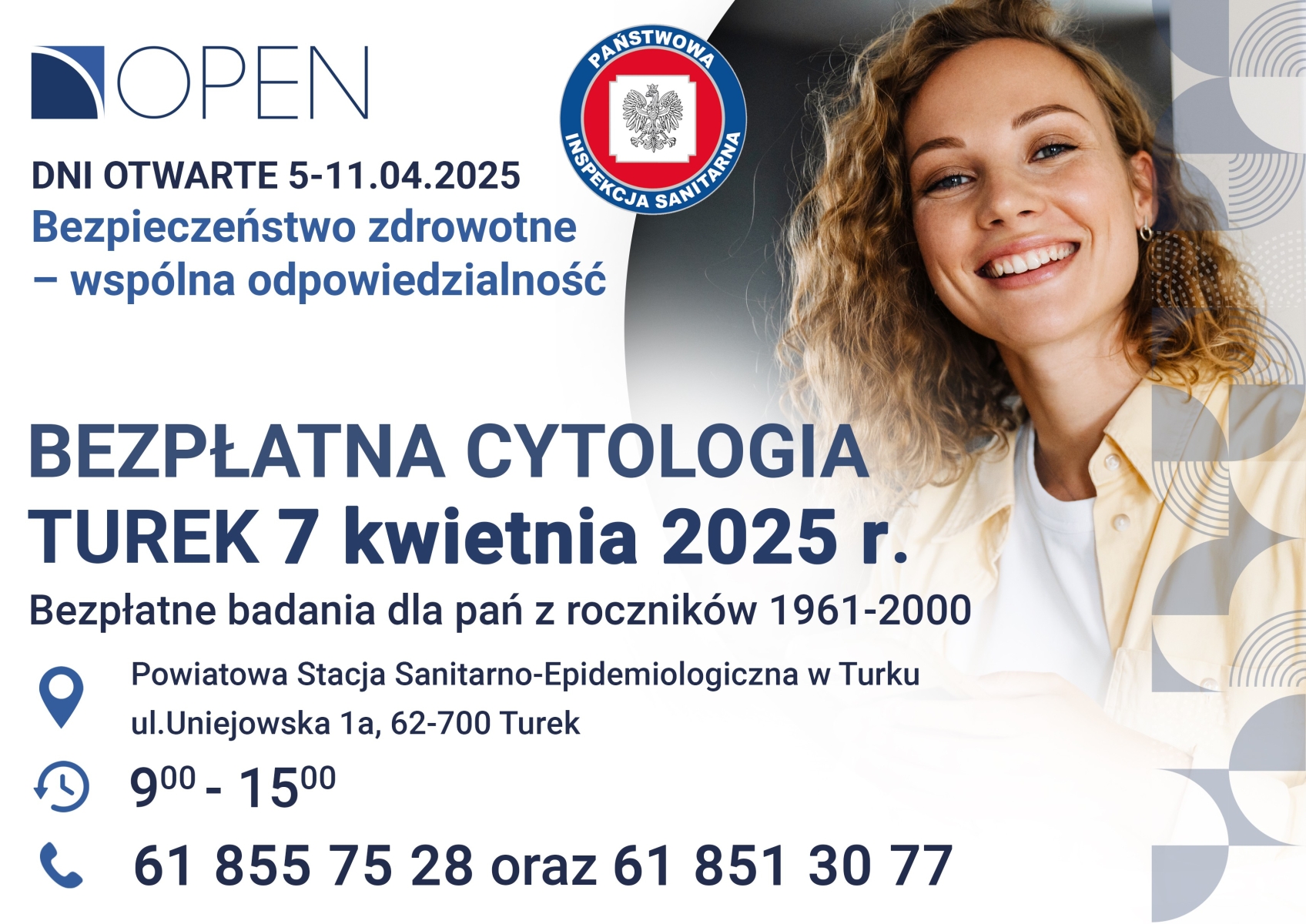 BEZPŁATNA CYTOLOGIA (Bezpłatne badania dla pań z roczników 1961-2000) 7 kwietnia 2025 r. Powiatowa Stacja Sanitarno-Epidemiologiczna w Turku ul. Uniejowska 1a, 62-700 Turek Rejestracja: 61 855 75 28 oraz 61 851 30 77