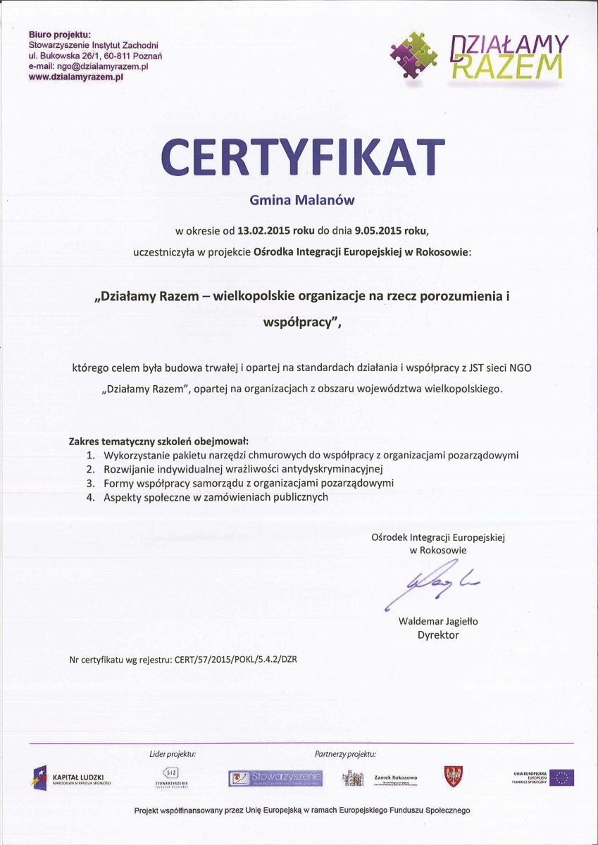 Gmina Malanów, jako jedna z nielicznych z gmin województwa wielkopolskiego uczestniczyła w projekcie „Działamy razem – wielkopolskie organizacje na rzecz porozumienia i współpracy” organizowanym w Ośrodku Integracji Europejskiej w Rokosowie.Celem szkolenia była budowa trwałej i opartej na standardach działania współpracy z JST sieci NGO „Działamy Razem”. Zakres szkolenia obejmował następujące bloki tematyczne: