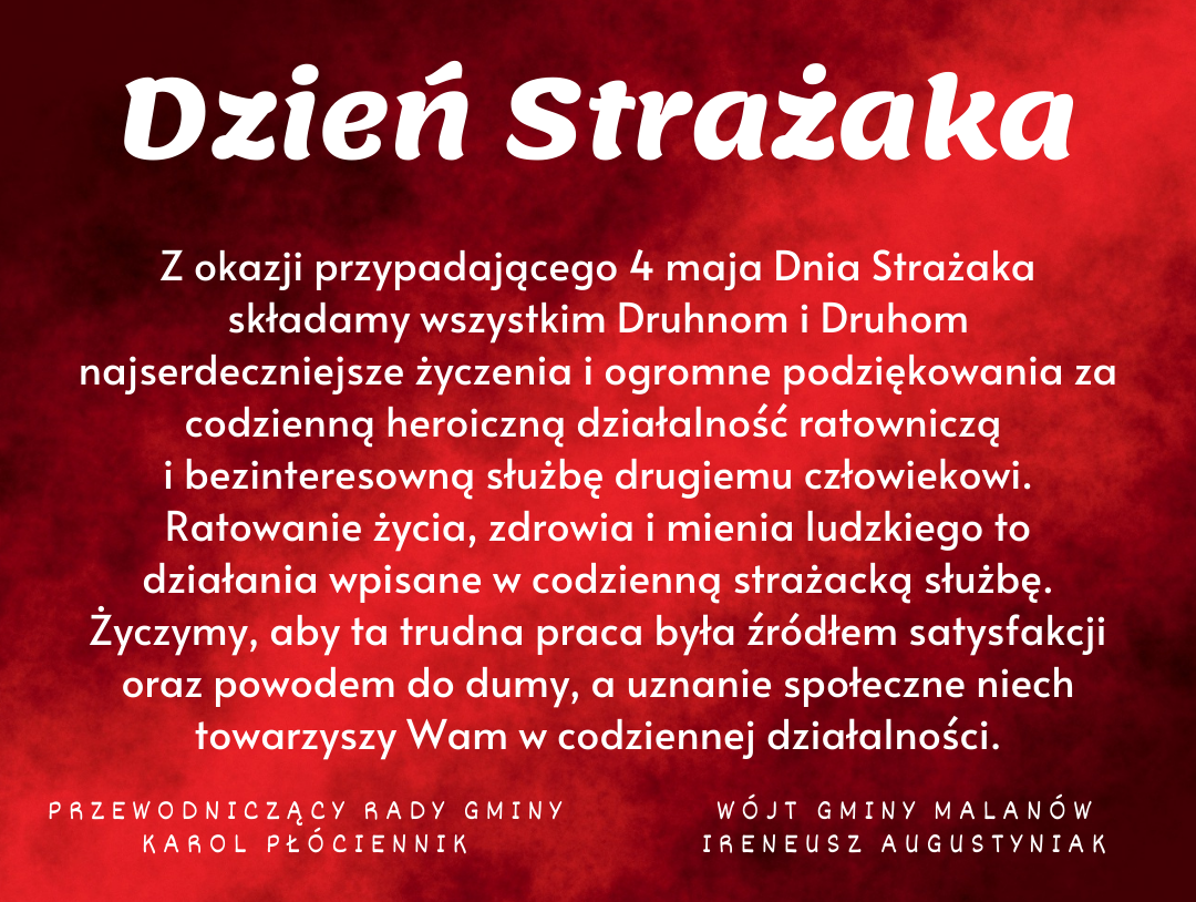 Z okazji przypadającego 4 maja Dnia Strażaka składamy wszystkim Druhnom i Druhom najserdeczniejsze