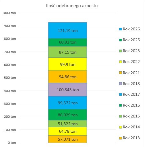 W ramach wsparcia w realizacji tego obowiązku, gmina od 2013 roku prowadzi działania związane z odbiorem, transportem oraz unieszkodliwianiem wyrobów zawierających azbest. W tym okresie udało się przekazać do utylizacji łącznie 923,137 ton niebezpiecznych materiałów. Poniżej przedstawiono zestawienie ilości odebranego azbestu w poszczególnych latach.
