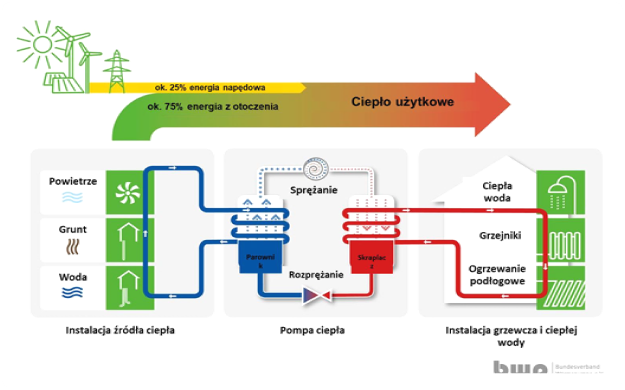 Pompa ciepła działa na zasadzie przenoszenia energii z otoczenia (tzw. dolne źródło ciepła) do budynku, umożliwiając efektywne zasilanie jego systemu grzewczego. Istnieją różne rodzaje pomp ciepła, takie jak powietrzne, gruntowe czy wodne, a ich działanie opiera się na wykorzystaniu energii pochodzącej ze środowiska naturalnego: powietrza, wody lub gruntu. Pompy ciepła wykorzystują zasadę odwróconego działania lodówki, a do ich pracy potrzebna jest niewielka ilość energii elektrycznej. Dzięki temu stanowią efektywne i coraz popularniejsze rozwiązanie do ogrzewania budynków oraz przygotowywania ciepłej wody użytkowej. Pompy ciepła składają się z kilku podstawowych elementów, takich jak parownik, sprężarka, skraplacz i zawór dławiący, a ich wygląd zależy od rodzaju i zastosowania. Kluczem w działaniu pomp ciepła jest czynnik chłodzący. A dokładniej jego temperatura parowania. Woda potrzebuje 100°C, aby się zagotowała. Uzyskana para wodna bardzo szybko oddaje ciepło do otoczenia. Niektóre czynniki parują w temperaturze poniżej zera, dzięki czemu możemy pobierać ciepło nawet z powietrza, które jest bliskie zeru lub nawet poniżej zera. Pobrane ciepło podgrzewa czynnik chłodzący, który paruje. Postać gazowa czynnika przekazywana jest do sprężarki, dzięki której, ciepło zostaje jeszcze bardziej podgrzane i skumulowane. Następnie podgrzany gazowy czynnik chłodniczy pod wysokim ciśnieniem może oddać swoje ciepło do instalacji ogrzewania i zbiornika ciepłej wody użytkowej (tzw. górne źródło ciepła). Po oddaniu ciepła czynnik ulega schłodzeniu i w postaci ciekłej przeprowadzony zostaje przez zawór rozprężny. W ten sposób schłodzony i w postaci ciekłej czynnik chłodniczy na nowo może pobierać ciepło z otoczenia. Cykl rozpoczyna się od początku. Dzięki pompie ciepła wykorzystujemy energię z odnawialnych źródeł w około 75 procentach. Pozostałe 25 procent to energia elektryczna. Taka sama zasada działania wykorzystywana jest w lodówkach, zamrażalkach, klimatyzatorach i nowoczesnych pralkach.
