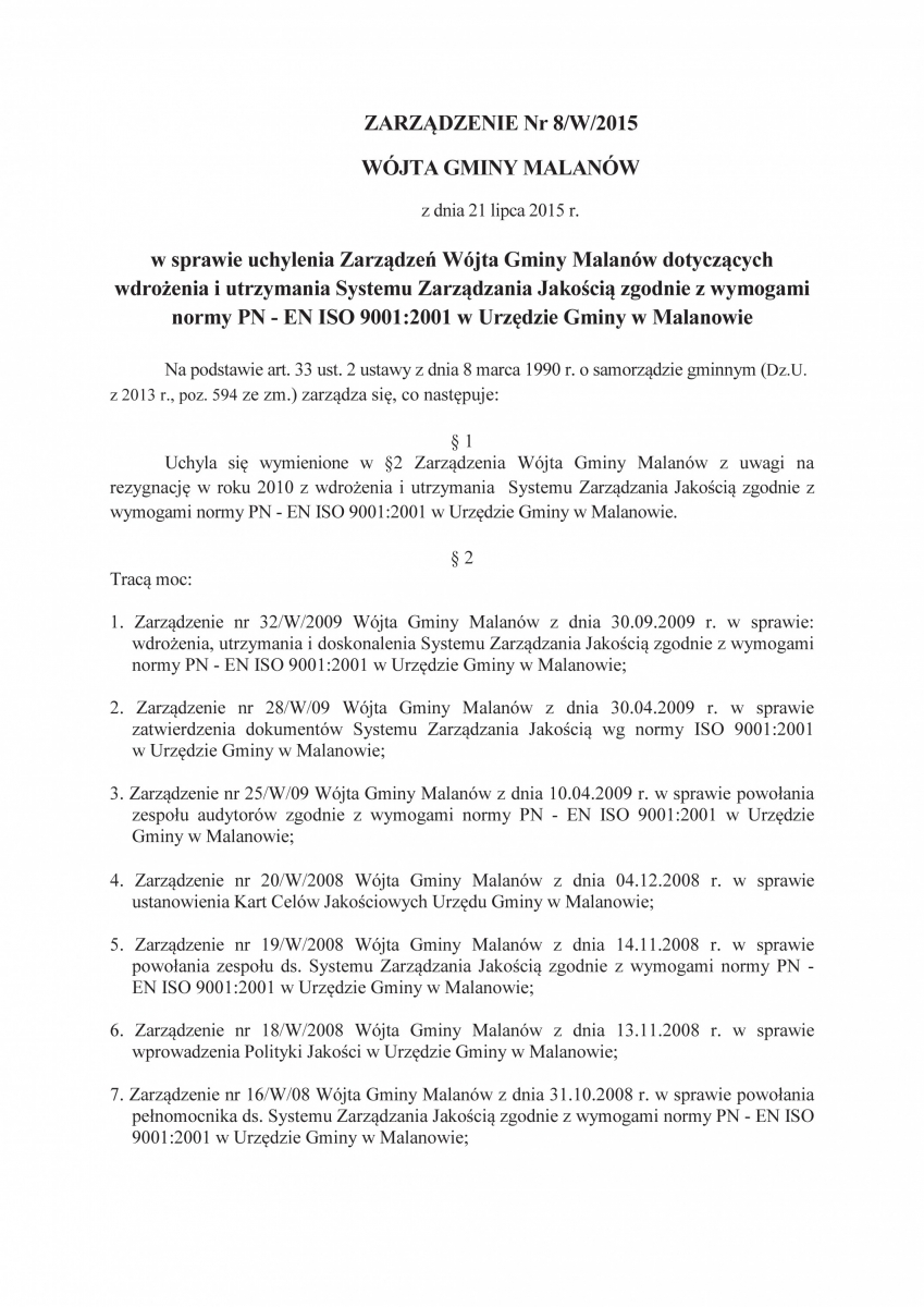 Pomimo tego w obowiązujących do 21 lipca br. zarządzeniach i Regulaminie Organizacyjnym UG nieistniejący System Zarządzania Jakością ISO był wciąż elementem organizacji pracy Urzędu Gminy w Malanowie.