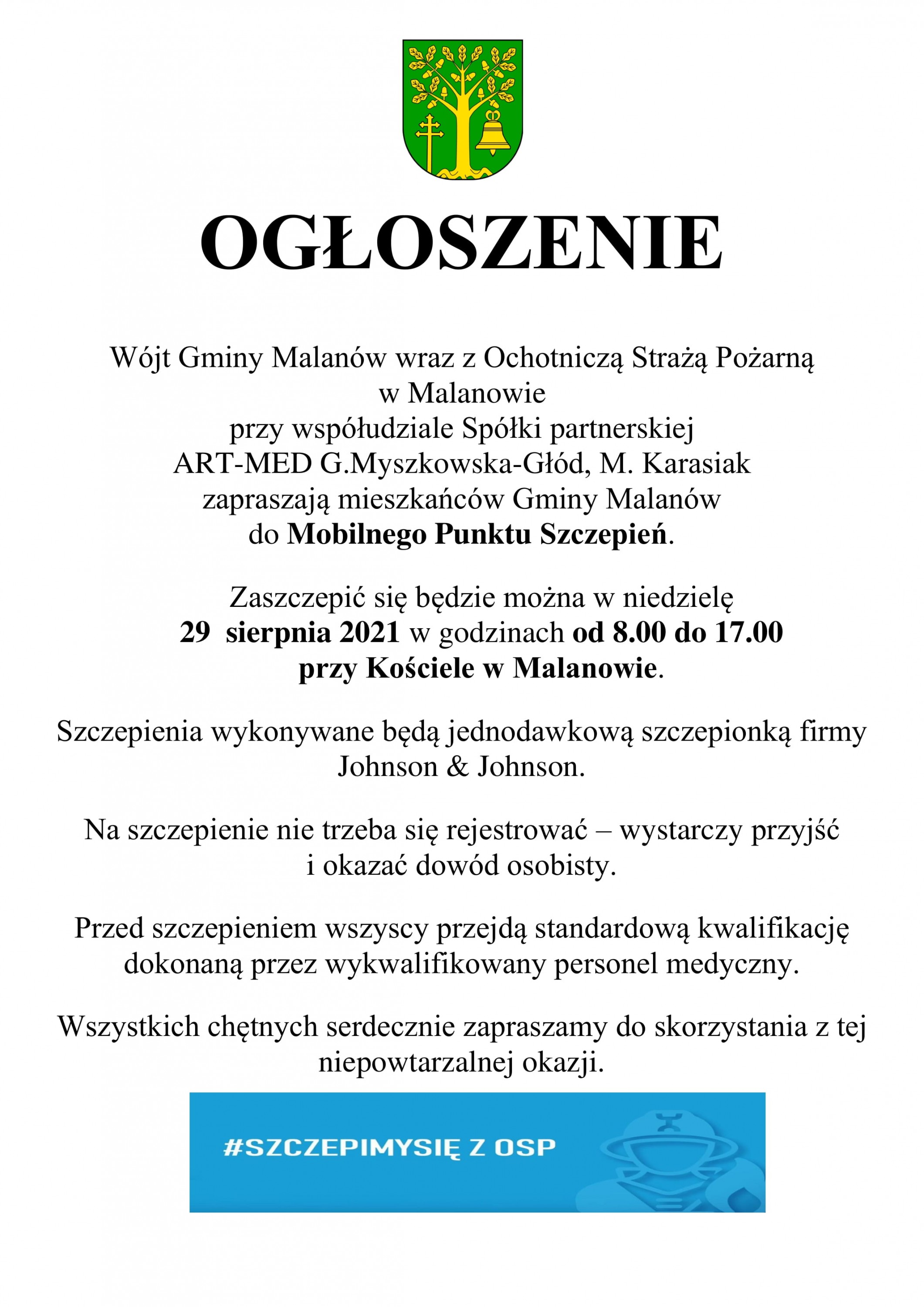 W najbliższą niedzielę przy kościele w Malanowie wszyscy zainteresowani będą mogli zaszczepić się przeciwko Covid-19. Jednodawkowy preparat firmy Johnson&Johnson podawany będzie w godzinach 8:00-17:00. Aby przyspieszyć proces szczepienia zapraszamy do odwiedzenia strony: https://pacjent.gov.pl/aktualnosc/szczepienia-przeciw-covid-19-pytania-pacjentow skąd można pobrać, wypełnić w domu i zabrać ze sobą fomularz przed szczepieniem (Kwestionariusz wstępnego wywiadu przesiewowego przed szczepieniem osoby dorosłej przeciw COVID-19).