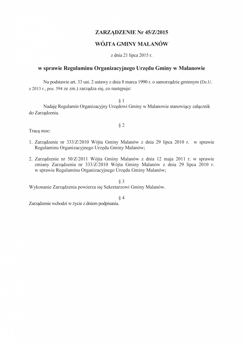 Do 21 lipca 2015 roku obowiązywał w Urzędzie Gminy w Malanowie jeszcze stary, pochodzący z 2010 roku Regulamin Organizacyjny Urzędu. Ostatniej jego aktualizacji dokonano w 2011 roku, stąd Regulamin ten zawierał sporo zapisów, które odstawały od rzeczywistości szybkich zmian prawnych i organizacyjnych w Urzędzie Gminy.