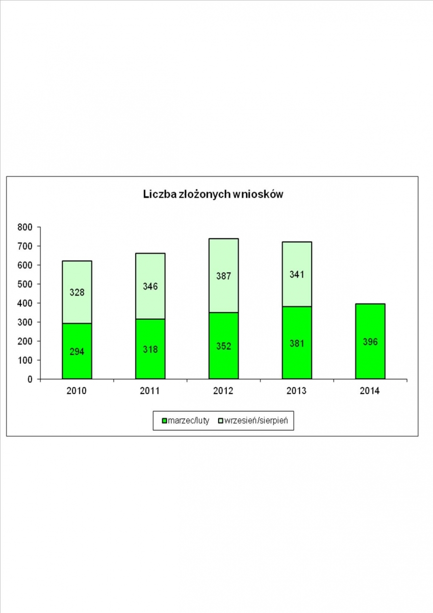 W latach 2010-2014 w pierwszym okresie (marzec/luty) zauważyliśmy ciągłą tendencję wzrostową wśród liczby rolników składających wnioski. W porównaniu do roku 2010, już pierwsza połowa 2014 roku dała nam wzrost liczby złożonych wniosków o ponad 100, co daje ogólny wzrost na poziomie 35 %. Podsumowując oba okresy składania wniosku (marzec/luty, wrzesień/sierpień) w latach 2010-2013 mamy tendencję wzrostową, jedynie w roku 2013 zauważalny jest mały spadek liczby złożonych wniosków.