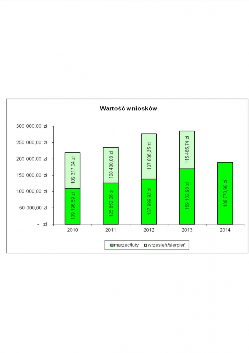 Wraz ze wzrostem liczby osób składających wnioski wzrasta również wartość środków przyznanych rolnikom. W pierwszym okresie składania wniosków czyli marzec/luty widzimy wyraźną tendencję wzrostową. Porównując rok 2010 z rokiem 2014 jest to wzrost o prawie 80 tysięcy złotych. Powyższe obrazują wykresy.
