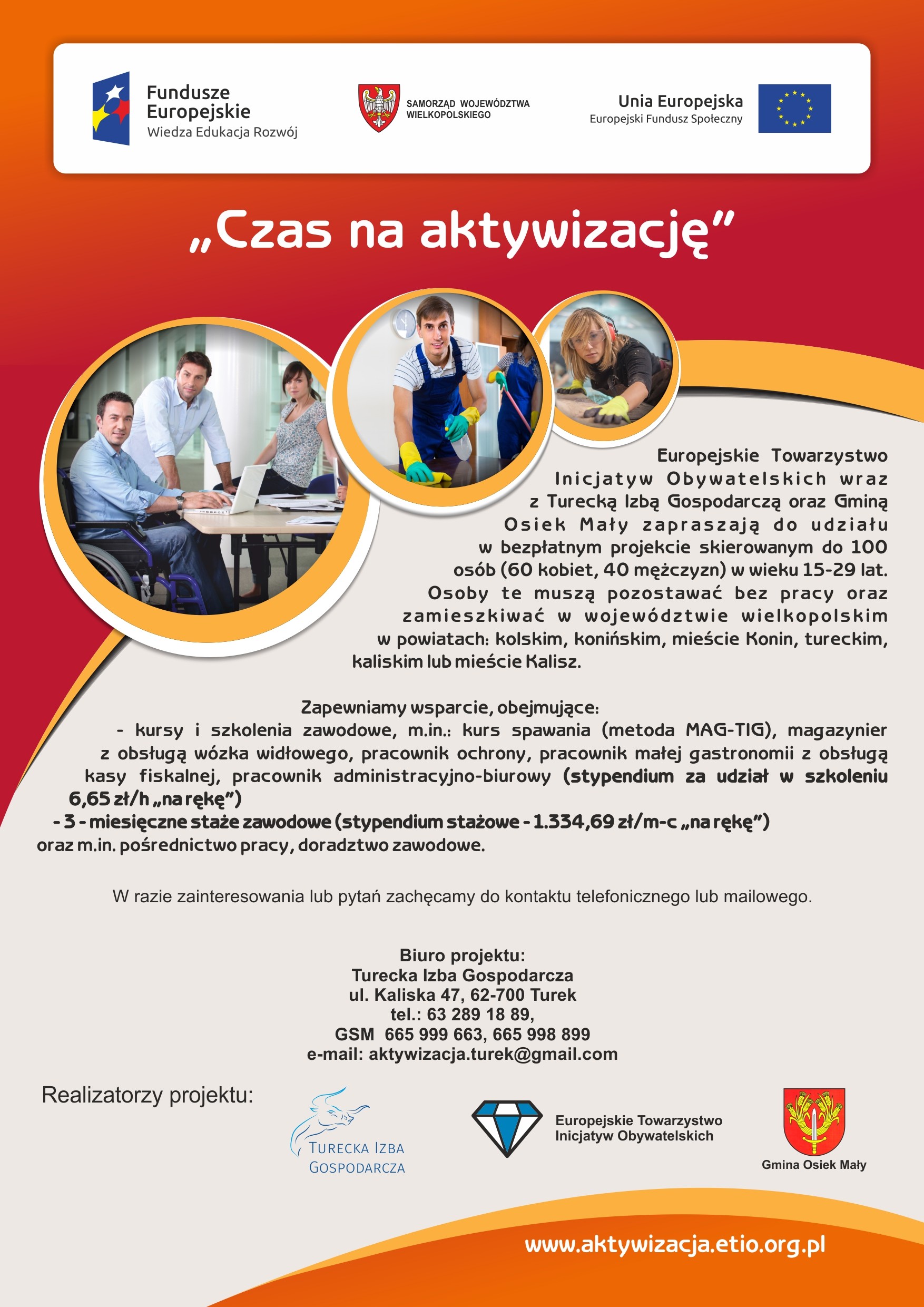 Turecka Izba Gospodarcza wraz z Europejskim Towarzystwem Inicjatyw Obywatelskich oraz Gminą Osiek Mały zapraszają do udziału w bezpłatnym projekcie pn. "Czas na aktywizację", skierowanym do 100 osób (60 kobiet, 40 mężczyzn) w wieku 15-29 lat (w tym bezrobotni, niepełnosprawni, bierni zawodowo, nieuczestniczący w kształceniu lub szkoleniu).