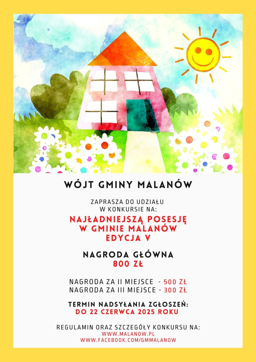Z przyjemnością informujemy, że startuje V edycja konkursu na najładniejszą posesję w Gminie Malanów. To wyjątkowa okazja, by pochwalić się zadbanym ogrodem, estetycznym otoczeniem domu i wkładem w piękno naszej gminy.