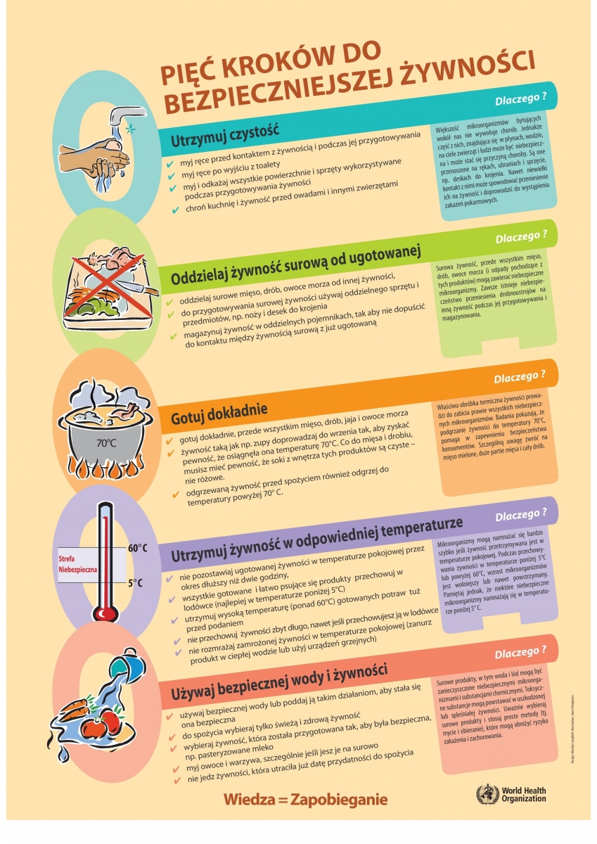 W związku z dużą potrzebą edukacji społeczeństwa, w celu zapobiegania chorobom spowodowanym nieodpowiednim żywieniem, Światowa Organizacja Zdrowia zaleca stosowanie i propagowanie „Pięciu kroków do bezpiecznej żywności”, tj.: