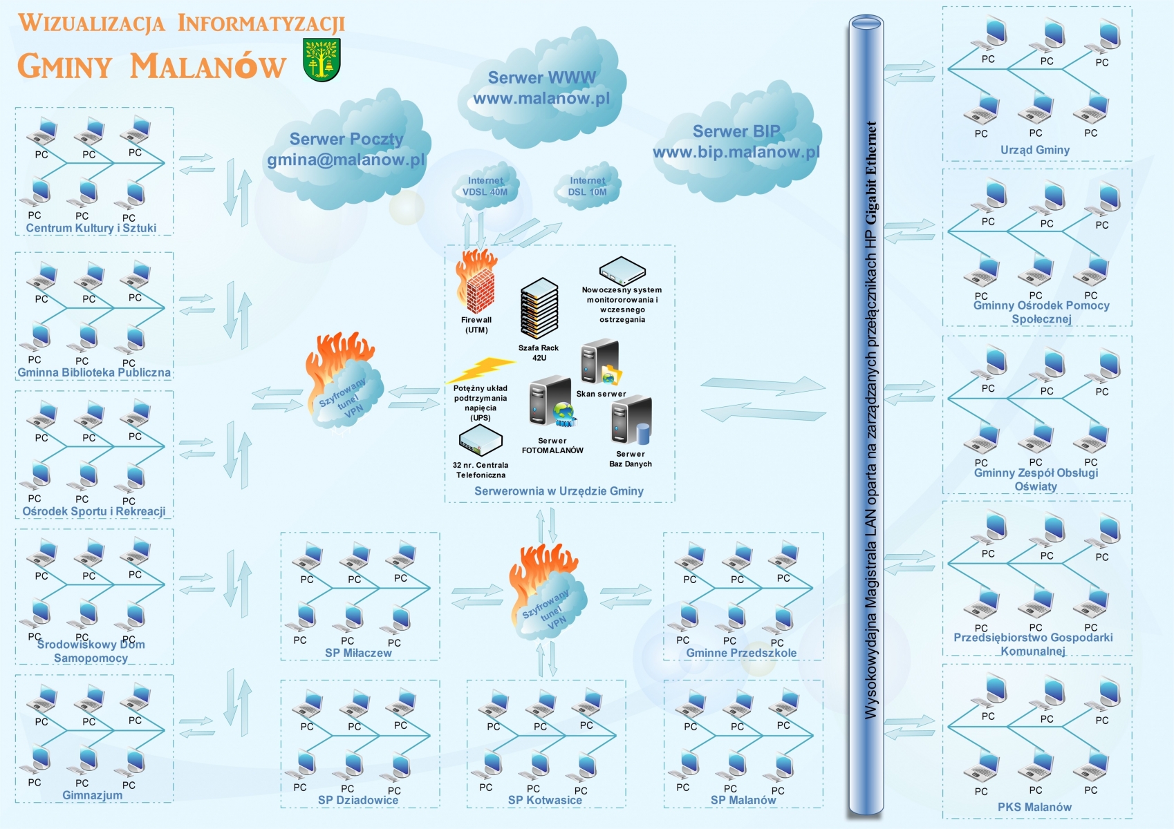 Aby utrzymać wysoką jakość obsługi naszych interesantów, stosujemy najnowsze technologie i rozwiązania z dziedziny informatyki. O tym jak wygląda system informatyczny Gminy Malanów mogą się Państwo przekonać klikając na załączoną grafikę.