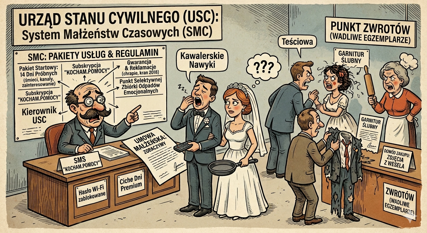 Kierownik USC, po konsultacjach z samym sobą, wprowadził rewolucyjny System Małżeństw Czasowych (SMC). Od 1 kwietnia sakramentalne „tak” zostaje zastąpione bardziej adekwatnym urzędowym „zobaczymy”..