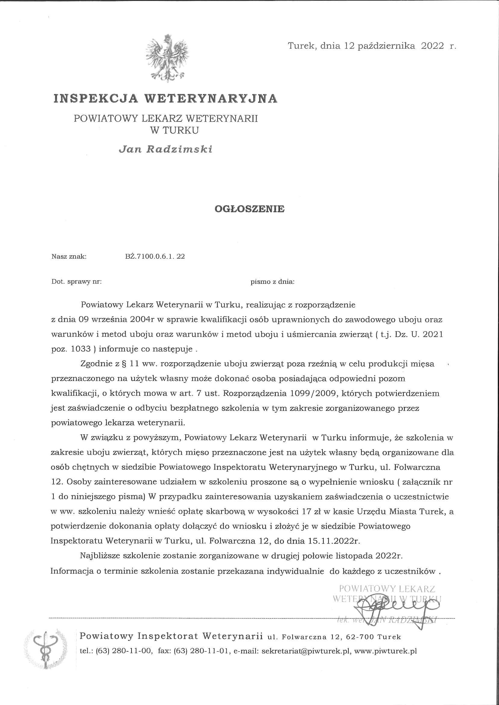 Powiatowy Lekarz Weterynarii w Turku, organizuje w siedzibie Powiatowego Inspektoratu Weterynaryjnego w Turku, ul. Folwarczna 12, szkolenie w zakresie uboju zwierząt, których mięso przeznaczone jest na użytek własny.