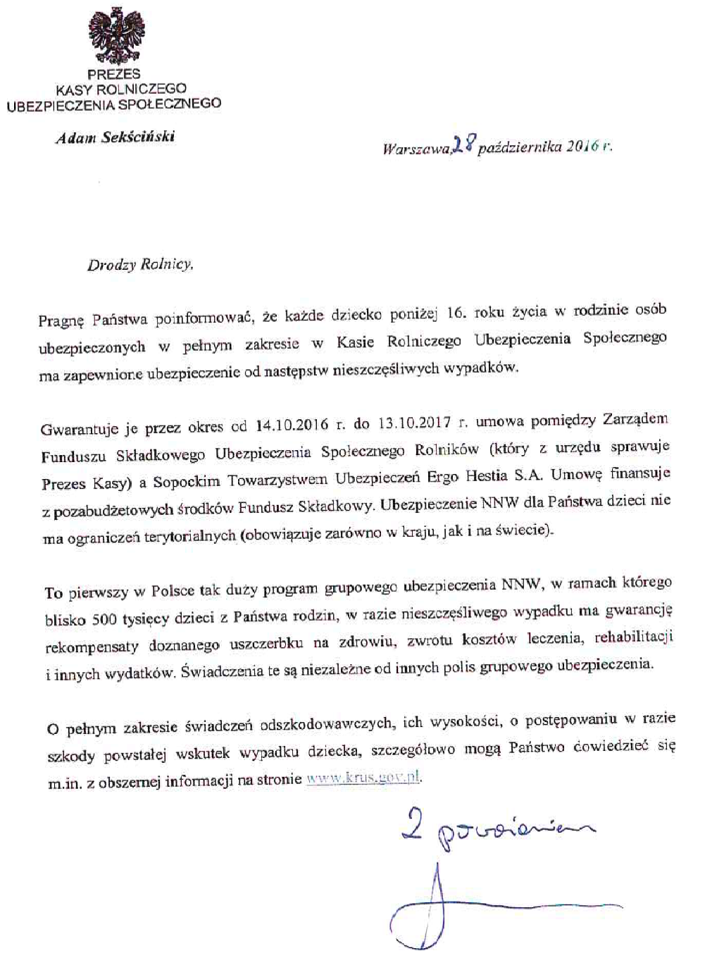 Zarząd Funduszu Składkowego Ubezpieczenia Społecznego Rolników zawarł 14 października 2016 roku z Sopockim Towarzystwem Ubezpieczeń Ergo Hestia S.A. umowę grupowego ubezpieczenia następstw nieszczęśliwych wypadków, obejmującą dzieci osób ubezpieczonych w KRUS.