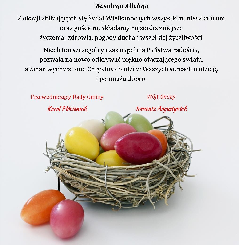 Z okazji zbliżających się Świąt Wielkanocnych wszystkim mieszkańcom oraz gościom, składamy najserdeczniejsze życzenia: zdrowia, pogody ducha i wszelkiej życzliwości.