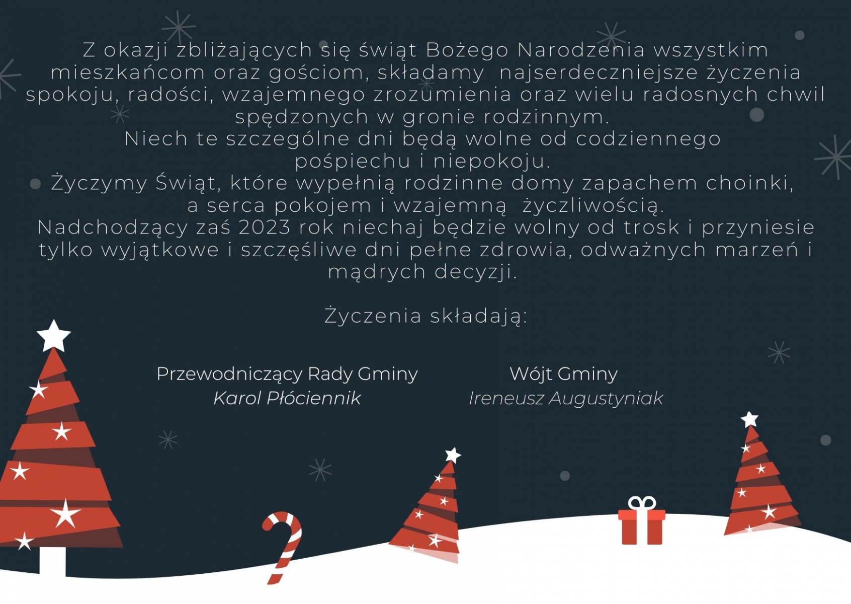 Z okazji zbliżających się świąt Bożego Narodzenia wszystkim mieszkańcom oraz gościom, składamy najserdeczniejsze życzenia spokoju, radości, wzajemnego zrozumienia oraz wielu radosnych chwil spędzonych w gronie rodzinnym.