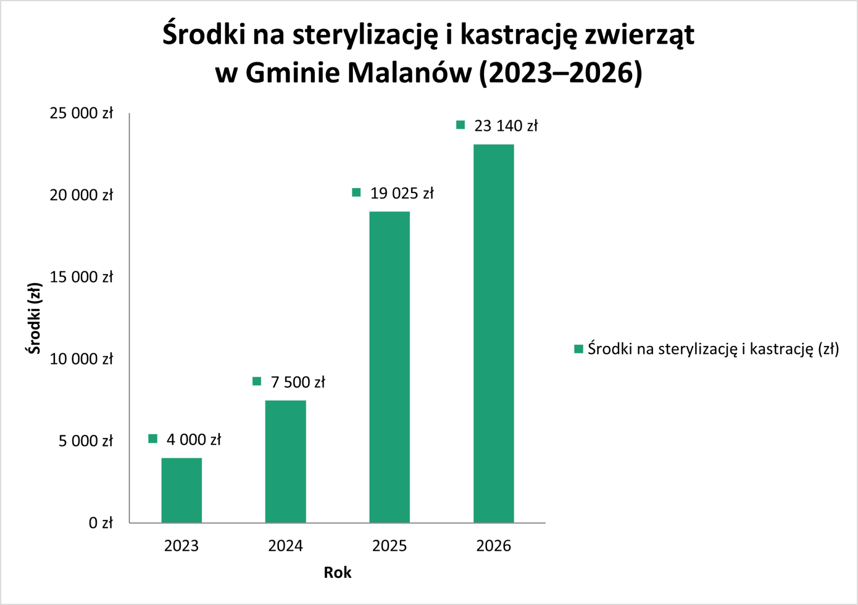 Program opieki nad zwierzętami bezdomnymi oraz zapobiegania bezdomności zwierząt na terenie Gminy Malanów obejmuje m.in. zapobieganie bezdomności zwierząt, zapewnienie opieki zwierzętom bezdomnym, prowadzenie działań informacyjno-edukacyjnych oraz promowanie właściwych postaw wobec zwierząt. Sam program to jednak nie wszystko. W ślad za jego zapisami w malanowskim budżecie planuje się środki finansowe na jego realizację. Łączna wysokość tych środków w 2026 roku wynosi 74 600 zł. W ramach wspomnianego programu podobnie jak w latach poprzednich, podpisano umowę na sterylizację i kastrację psów i kotów. Gmina Malanów odpowiadając na rosnące zainteresowanie mieszkańców tymi zabiegami stopniowo, ale znacząco zwiększyła środki na ten cel.