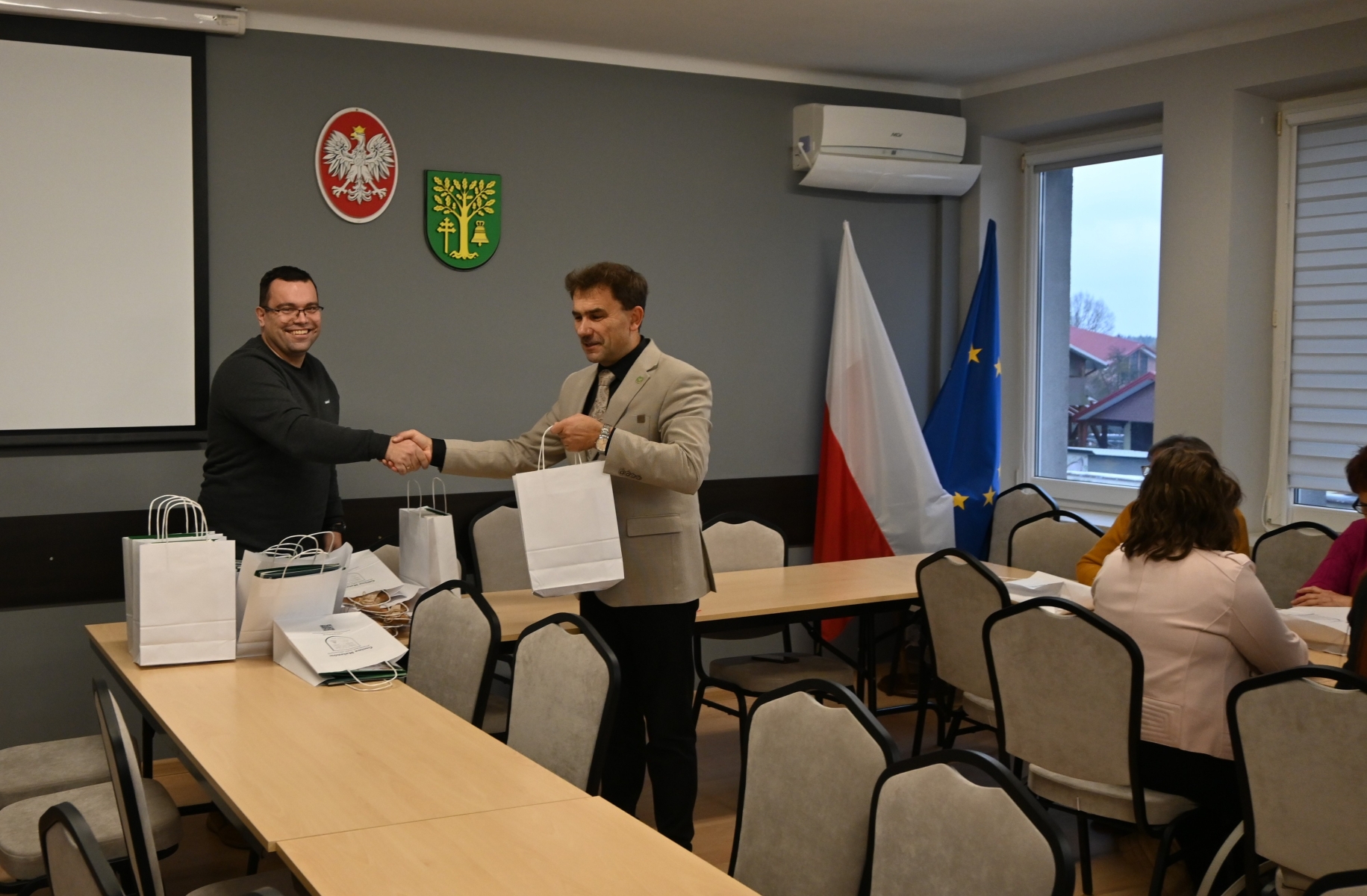 W dowód uznania i wdzięczności Wójt przekazał zaproszonym gościom symboliczne upominki, dziękując za ich wkład w organizację wydarzenia oraz aktywny udział w samym kiermaszu.