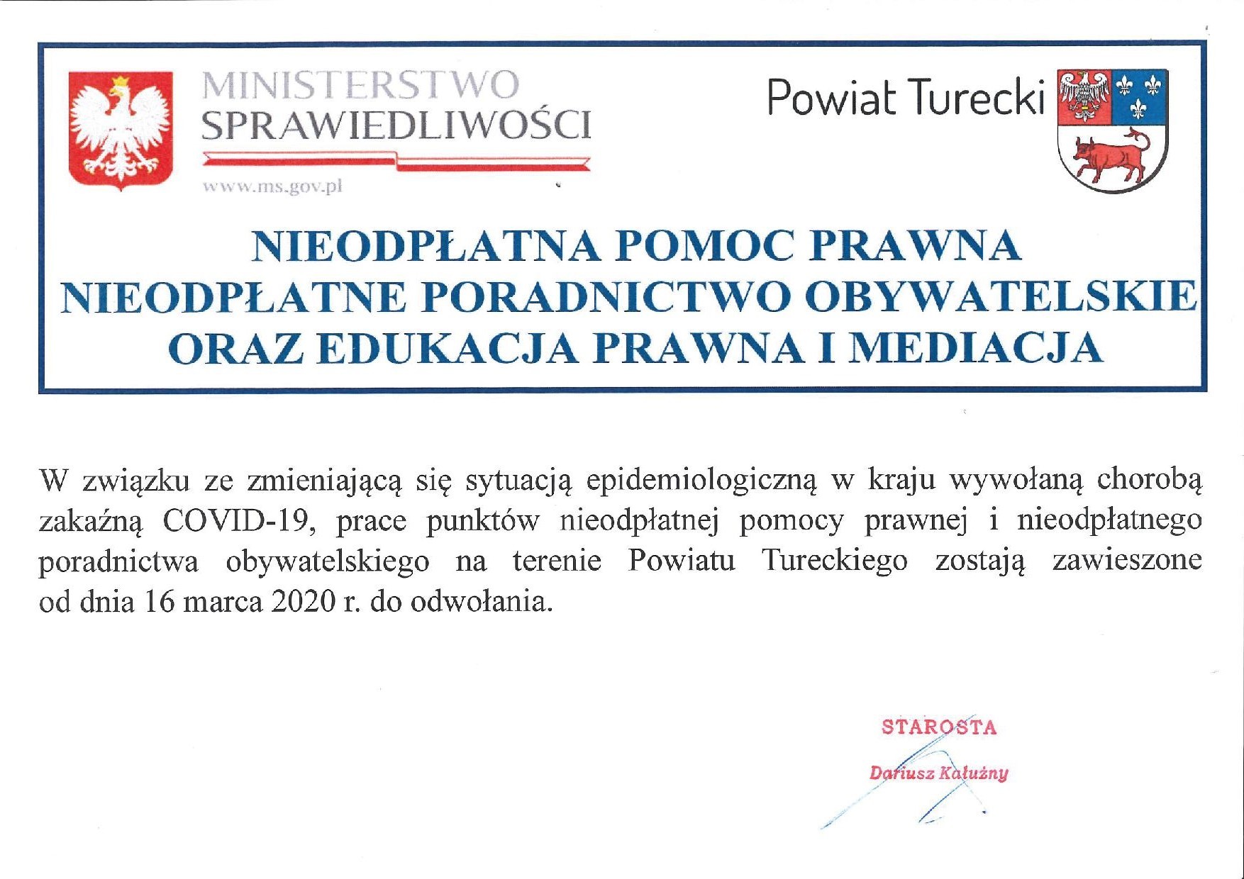 W dniu dzisiejszym Starosta Turecki zawiesił aż do odwołania pracę punktów nieodpłatnej pomocy prawnej i nieodpłatnego poradnictwa obywatelskiego.